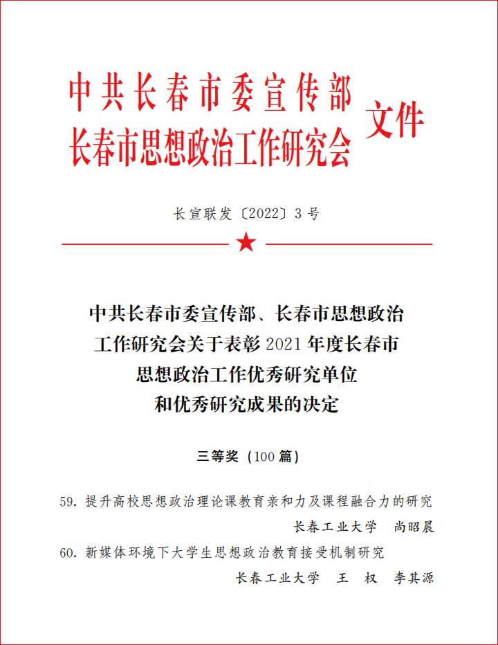 本网讯(通讯员 李其源)近日,中共长春市委宣传部、长春市思想政治工作研究会联合下发《关于表彰2021年度长春市思想政治工作优秀研究单位和优秀研究成果的决定》(长宣联发〔2022〕3号),best365官方网站登录入口尚昭晨撰写的《提升高校思想政治理论课教育亲和力及课程融合力的研究》、王权主持撰写的《新媒体环境下大学生思想政治教育接受机制研究》荣获三等奖。