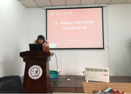 12月13日上午9点,在学院资料室研究生助理耿雅楠代表本次参加实践学习活动的同学们为2018级研究生作了实训工作的思想汇报。她向在座的各位同学们介绍了参观全国爱国主义教育示范基地——二战盟军高级战俘营、车立方党群指导服务中心——一汽集团、长春汽车高专产学研辽源综合实训基地、全国精神文明村、吉林省农村干部培训基地、朝阳实训基地等情况并分享了实践学习活动的收获与心得。