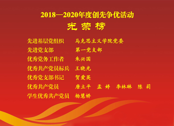 在2018—2020年度创先争优活动中,best365官方网站登录入口党委荣获“先进基层党组织”称号;学院党委书记朱兴国被评为优秀党务工作者;第一党支部被评为先进党支部,贺爱英被评为优秀党支部书记;副院长王晓光被评为优秀共产党员标兵,唐立平、孟婷、李林琳、陈莉被评为优秀共产党员,杨慧娇被评为学生优秀共产党员。