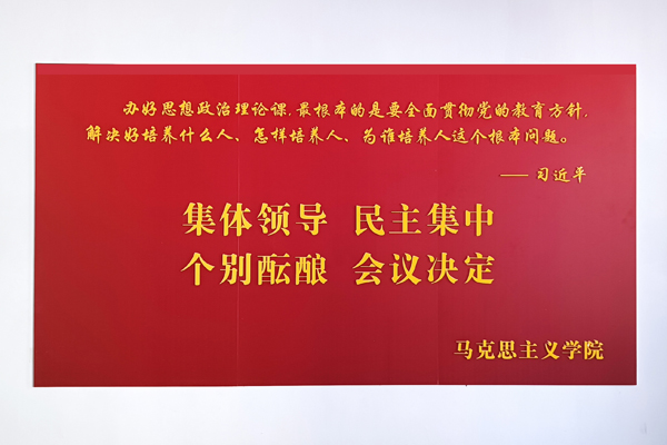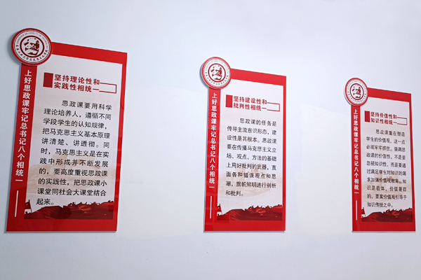 文化墙以学院现有办公教学场所、党员活动室和会议室为主要区域,内容涵盖了习近平总书记对思政课教师的殷殷嘱托和谆谆教诲、学院简介、教师宣誓、风采展示等主题,形式简洁大气,布局庄重大方,充分体现了时代赋予高校best365官方网站登录入口的铸魂育人、立德树人的历史使命和光荣任务,营造了“处处是课堂、时时受教育”的浓厚氛围。